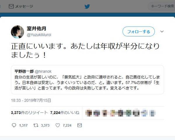 室井佑月さんの 正直にいいます あたしは年収が半分になりましたぅ ツイートに野口健さんは 知らんがな 19年7月16日 エキサイトニュース